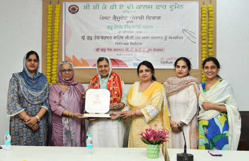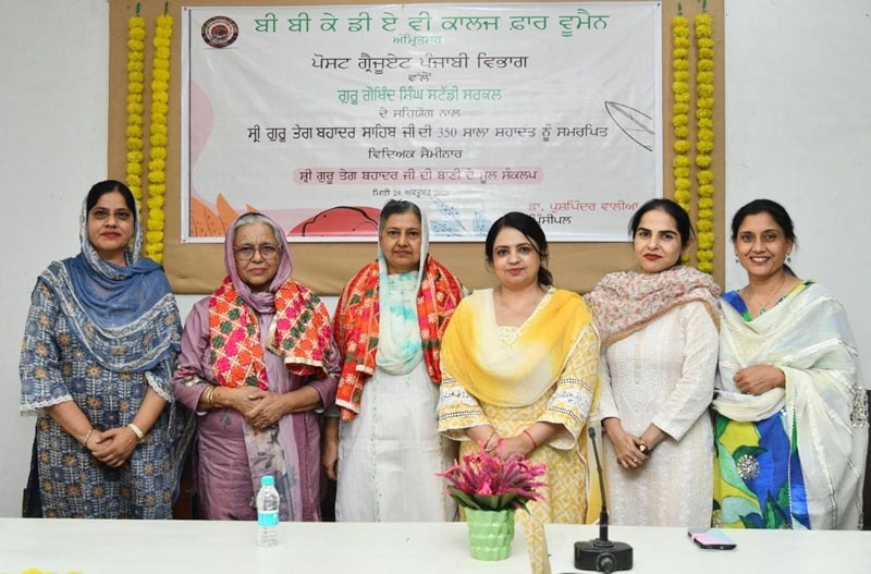The PG Department of Punjabi, BBK DAV College for Women, Amritsar, in collaboration with Guru Gobind Singh Study Circle, organized a seminar to commemorate the 350th anniversary of the supreme sacrifice of Sri Guru Tegh Bahadur Sahib Ji. The seminar aimed to highlight the timeless message of Guru Sahib’s life and teachings and to explore their enduring relevance in the contemporary world.