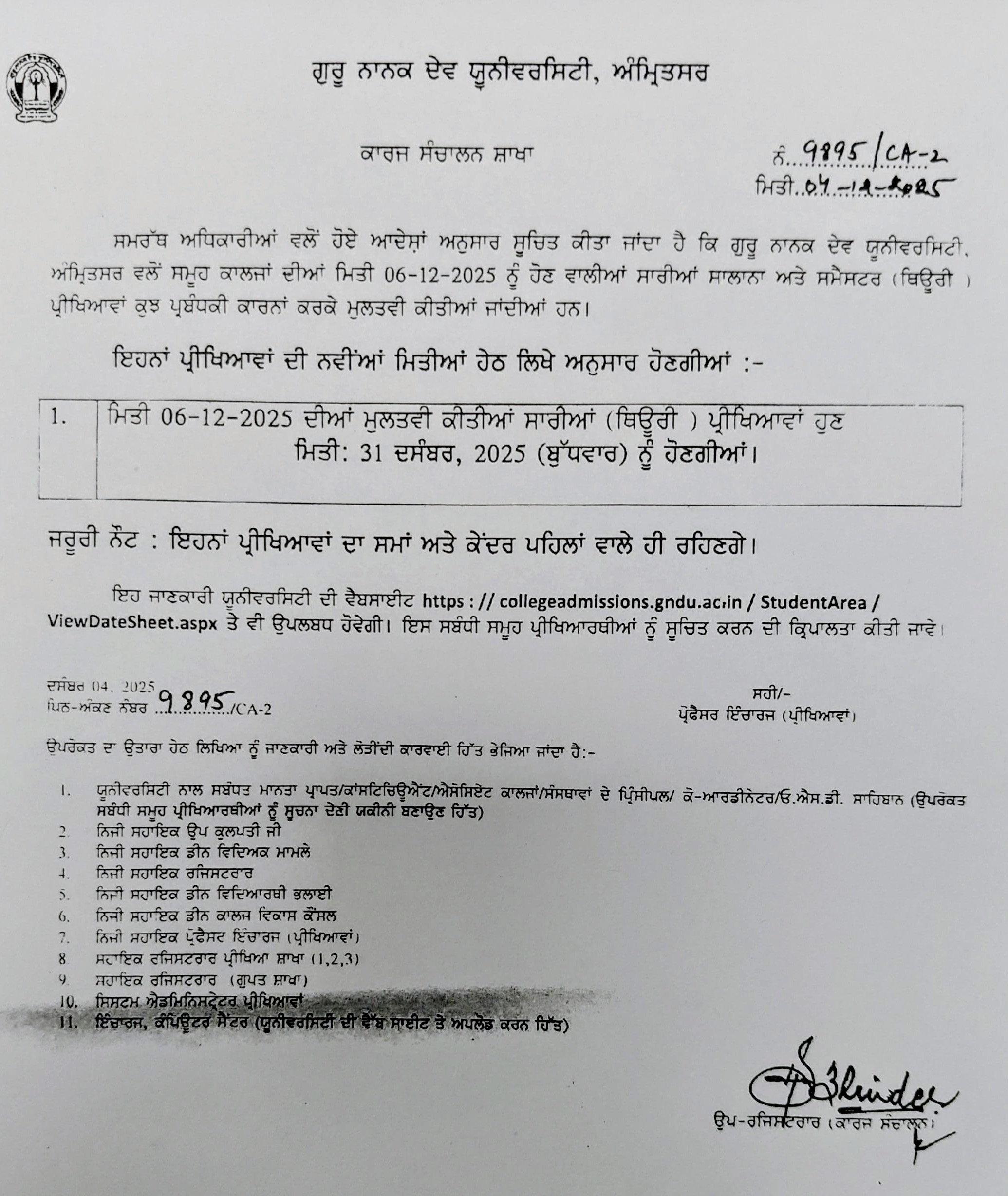 As per the directions of GNDU, examinations to be held on 6th December, 2025 are postponed and will be held on 31st December, 2025. [Click to view GNDU notification]